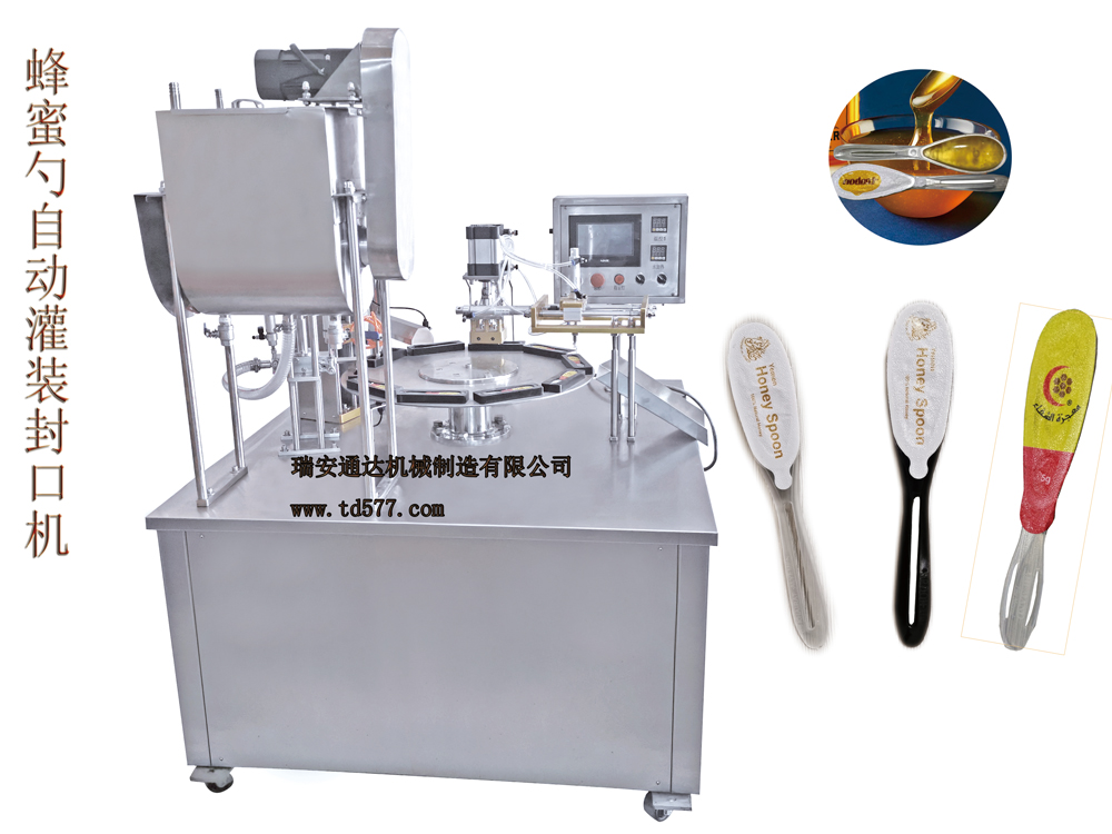 本機器適用于蜂蜜勺等異型容器的自動灌裝封口。用于勺狀蜂蜜,勺狀咖啡粉等包裝。